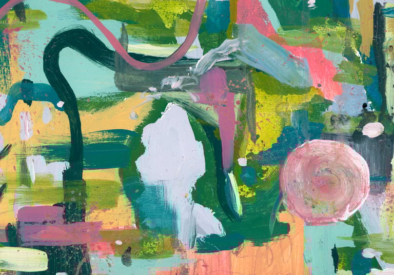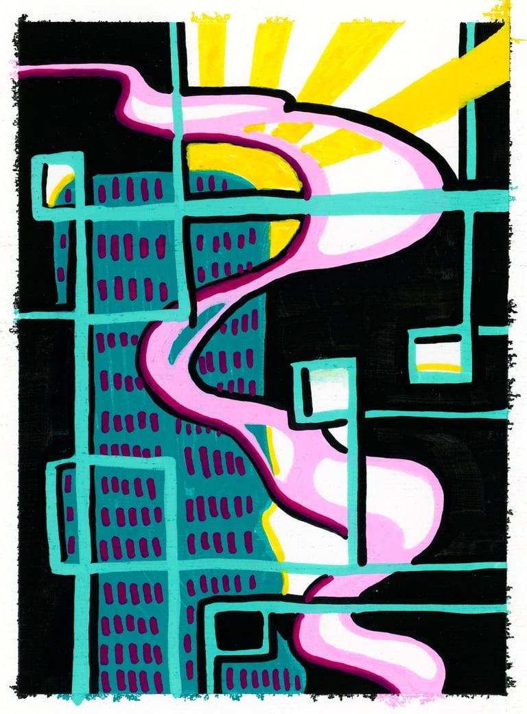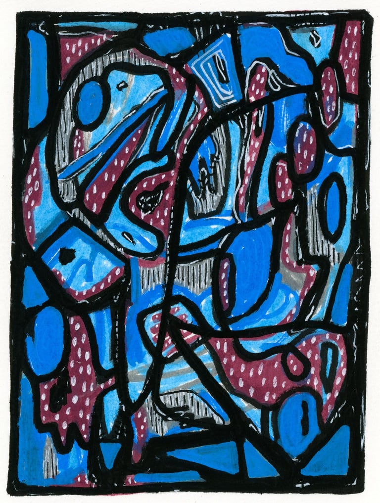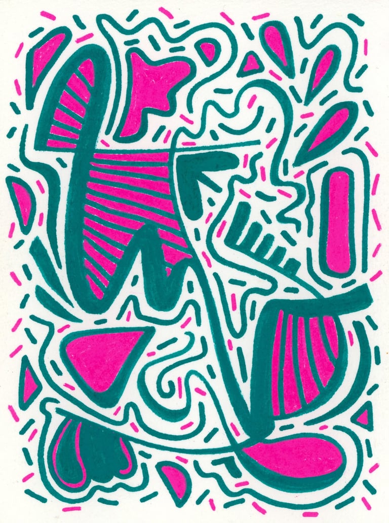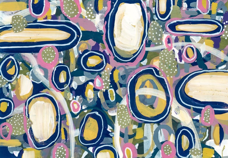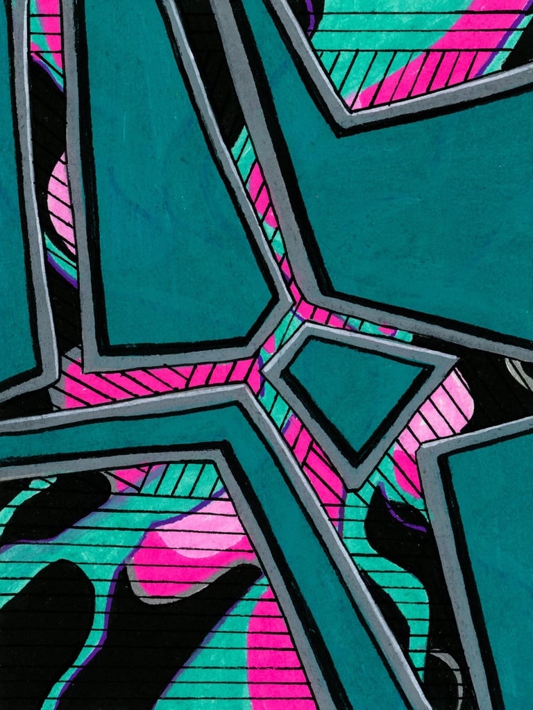 This collection explores bold geometry, stylized structure, and intuitive rhythm. While the shapes may seem planned, each composition is built through a responsive, instinctive process - what feels missing, what wants to echo, where contrast needs to land. I follow a call-and-response approach, letting each line or form guide the next until the piece feels resolved. Some works lean abstract, others more playful or graphic, but all share a foundation in dynamic structure and vibrant contrast.